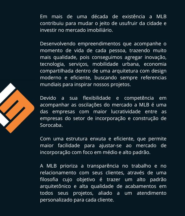 Registro de memorial de incorporação sob nº 16.4627 pelo 2º cartório de registro de Sorocaba. Incorporação e Construção MLB EMPREENDIMENTOS IMOBILIARIOS LTDA CNPJ: 17.336.285/0001-39. Financiamento sob análise e aprovação da Caixa Econômica Federal. Todas as imagens e perspectivas contidas neste material são meramente ilustrativas, podendo sofrer alterações. Os materiais de acabamento serão entregues conforme memorial descritivo. Projeto executivo em desenvolvimento podendo sofrer pequenas alterações durante os ajustes técnicos, inclusive medidas internas. As vistas apresentadas em todas as imagens são meramente elucidativas. Consulte o memorial descritivo e a planta arquitetônica da unidade autônoma. Condições comerciais passíveis de alterações a qualquer tempo, consulte a empresa de vendas. Consulte condições e validade dos valores e bônus promocional consulte a empresa de vendas. Comercialização: SOU IMOB Negócios Imobiliários Ltda – CRECI 45164-J. Site, integrações e automações desenvolvidos e hospedados por: NConecta.com.br a pedido de: SOU IMOB Negócios Imobiliários. Atualizado em: FEV/2024